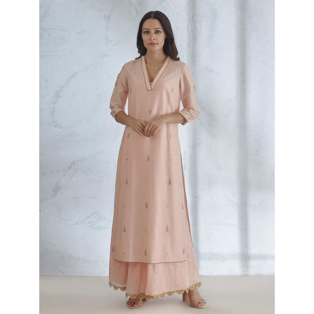 Description : Accessorize yourself with this gorgeous and elegant peach kurta, palazzo, & dupatta set from Mandira Wirk. Exquisitely crafted in premium cotton for a soft touch and unhindered convenience, this beauty comes with a mesmerizing embroidered pattern to add that stylish charm to your regular boring look. Style this set with a trendy choker necklace and high heels to complete the look.
