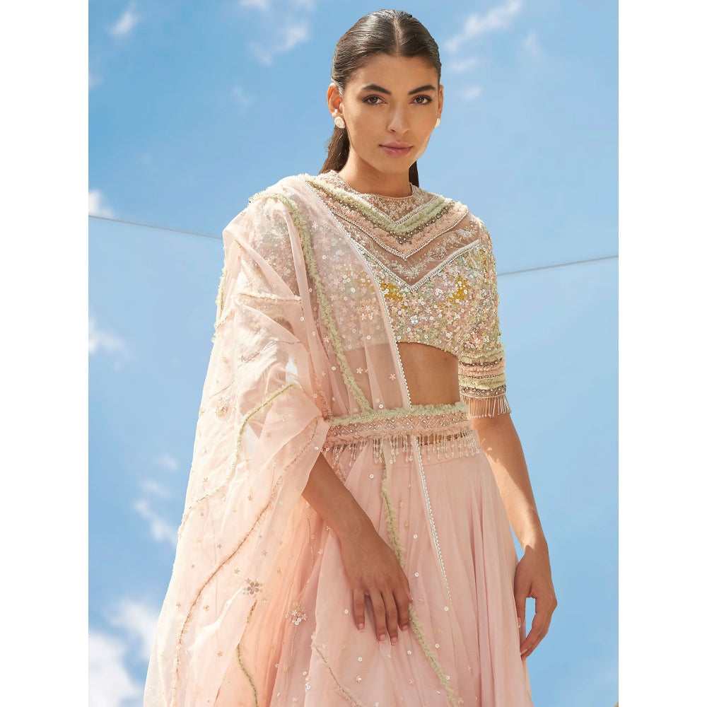 Mandira Wirk Peach Valley Of Flower Embroidered Valley Skirt With Kurta & Dupatta (Set of 3)