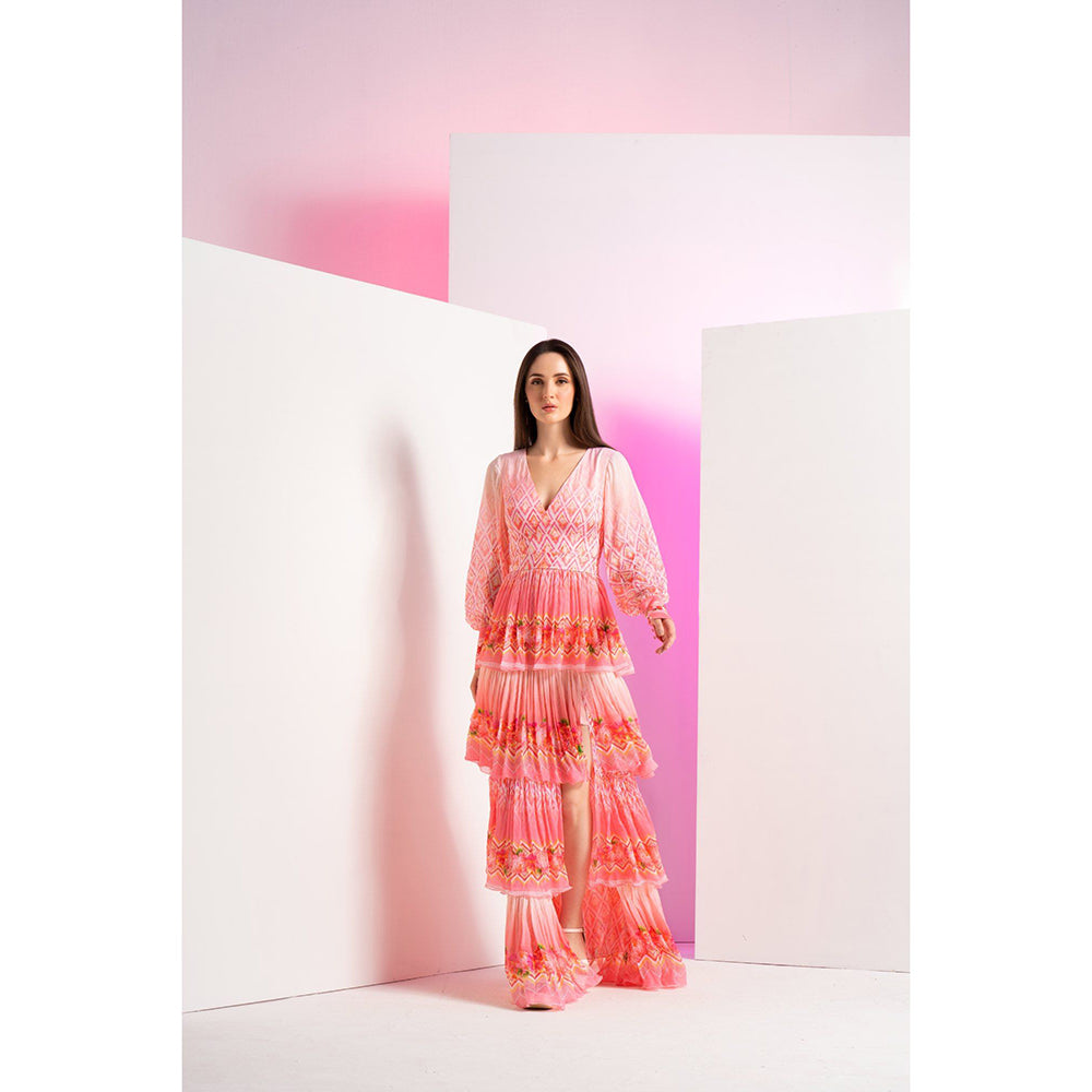MANDIRA WIRK Pink Bud And Bloom Long Layered Maxi Dress With Belt (Set of 2)