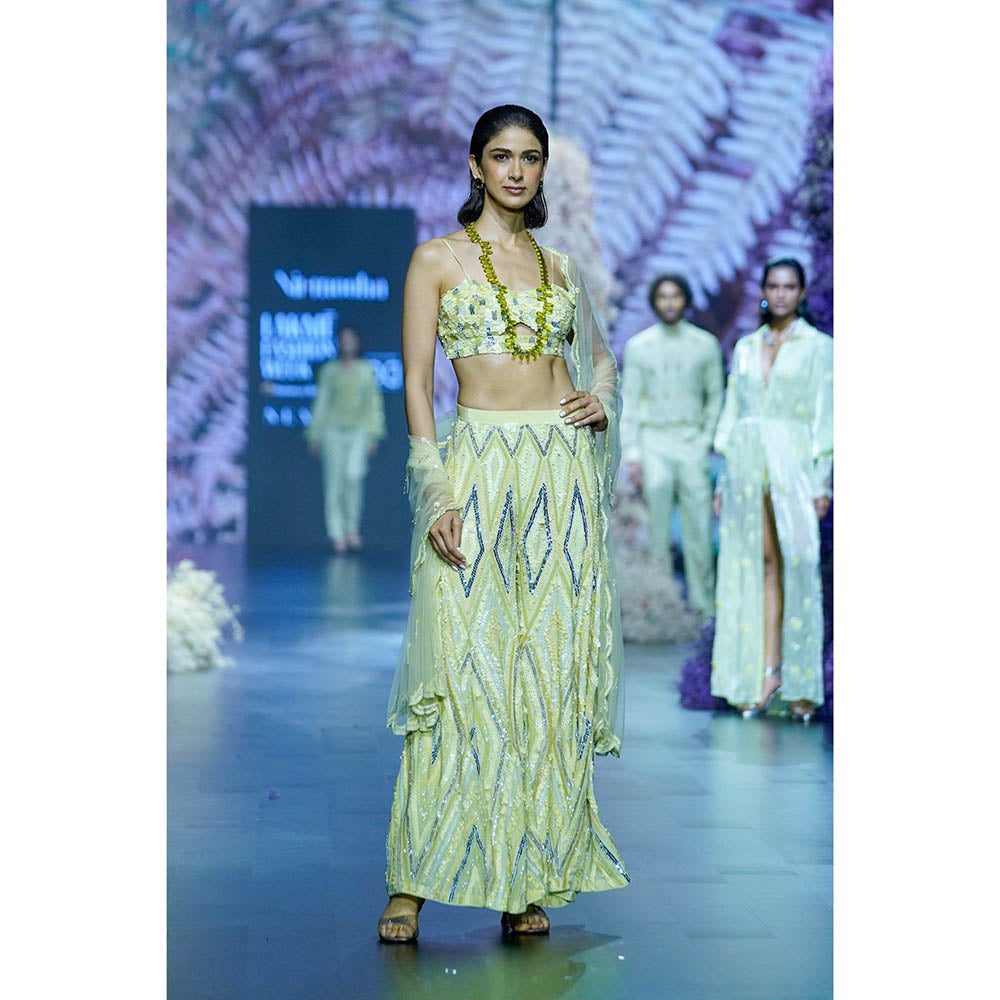 Description : Jazz up your look with this green set from Nirmooha. Crafted from crepe, it is finished with a sleeveless design and shoulder straps. Complete the look with a pair of heels and statement jewellery.