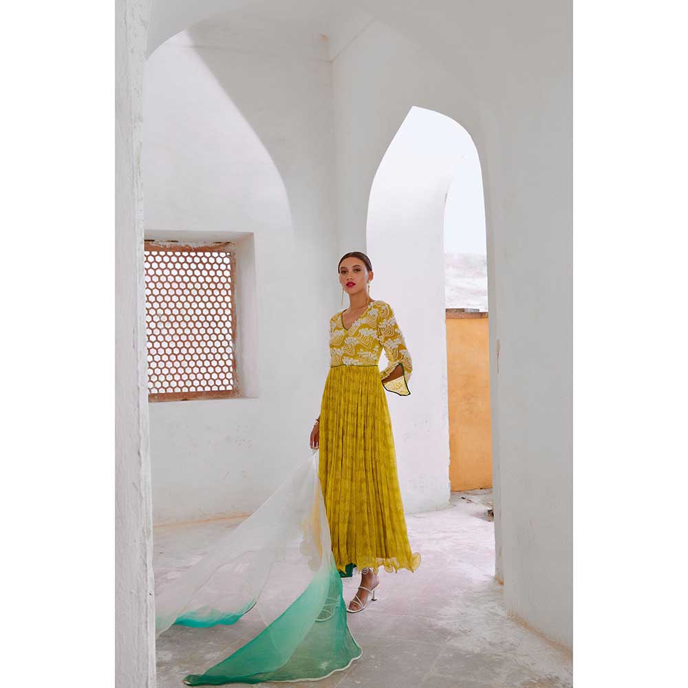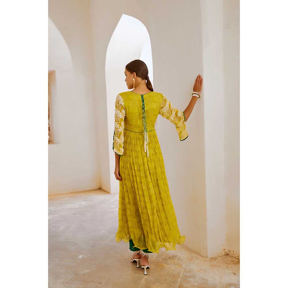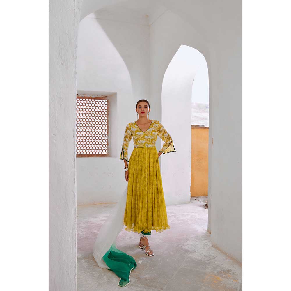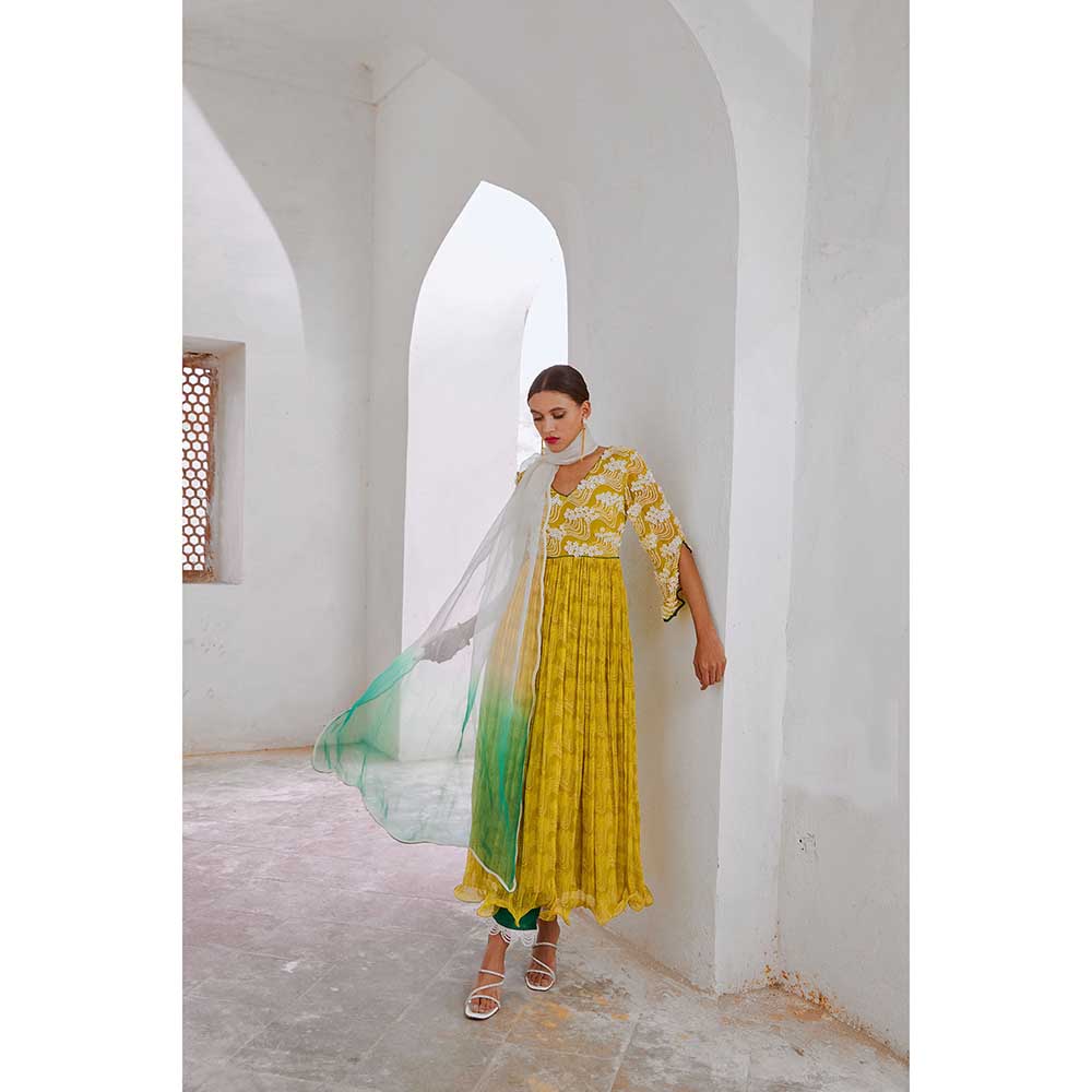PALLAVI JAIPUR Lemon Green Bahara Anarkali Kurta With Pant & Dupatta (Set of 3)