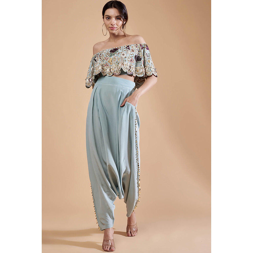 Description : Powder Blue Crepe Embroidered Off Shoulder Top with Low Crotch Pant.