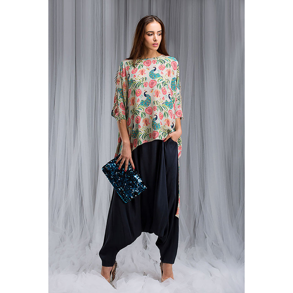 Description : Curate a stunning ensemble with this set by Payal Singhal. Made with the finest material, it features a kaftan that has a boat neck and three-fourth sleeves. The mid-waist dhoti pants have a wide-leg silhouette. Style this set with jhumkas, mules, and a potli bag to complete the look.
