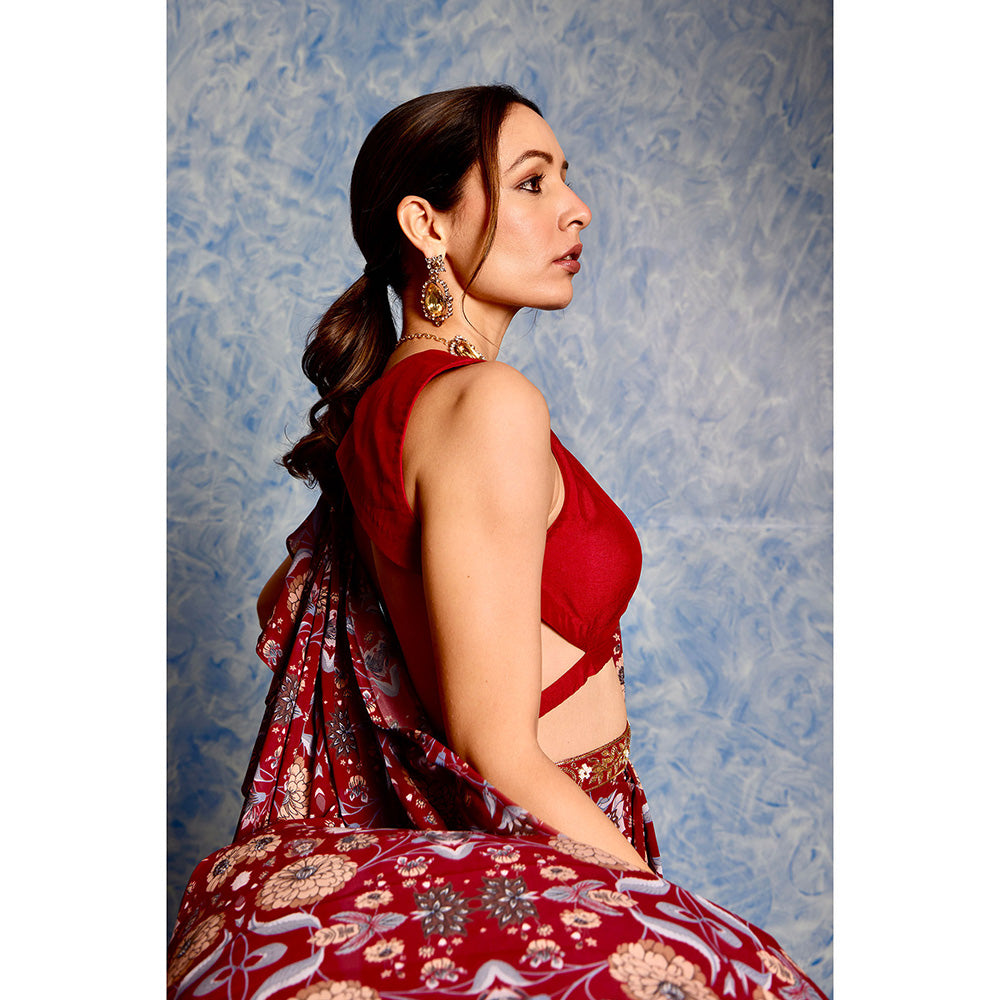 Rashika Sharma Maroon Nitara Ruffle Pre Stitched Saree with Belt with Stitched