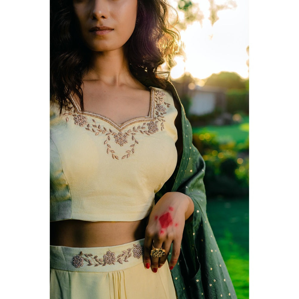 Description : Featuring A Forest Green Chanderi Cape & Lehenga In Raw Silk And Georgette Base With Saadi, Kasab And Moti Hand Embroidery. It Is Paired With Embroidered Raw Silk Blouse And Cape.