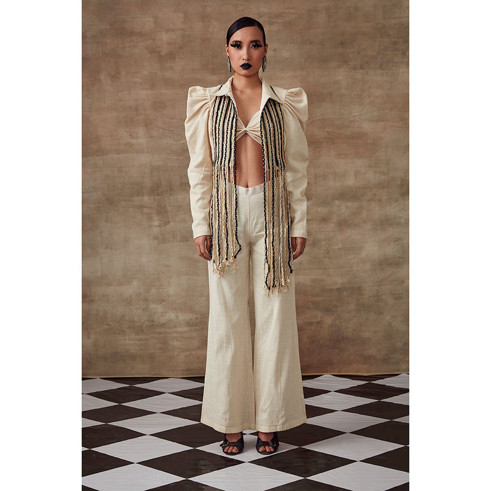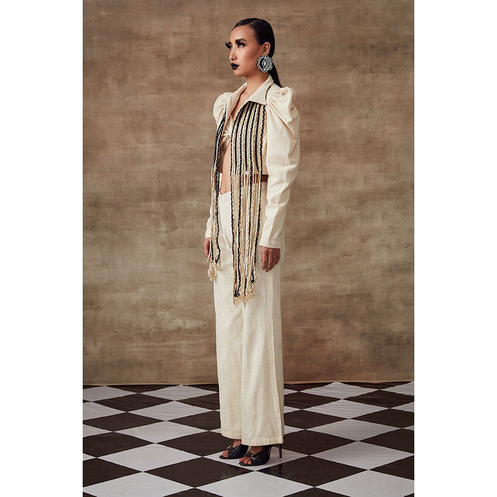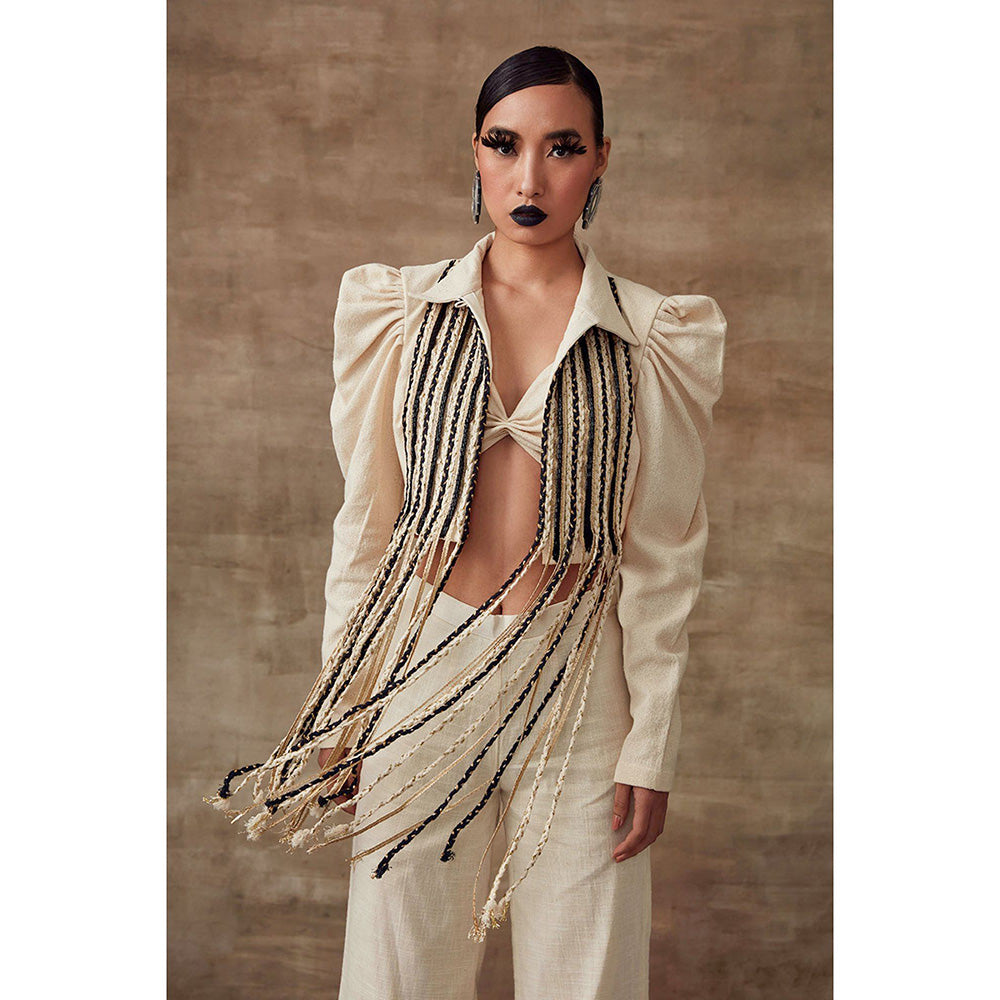 Description : Featuring a short jacket essembled with intricate workmanship with the play of dories paired with straight and twisted tube.