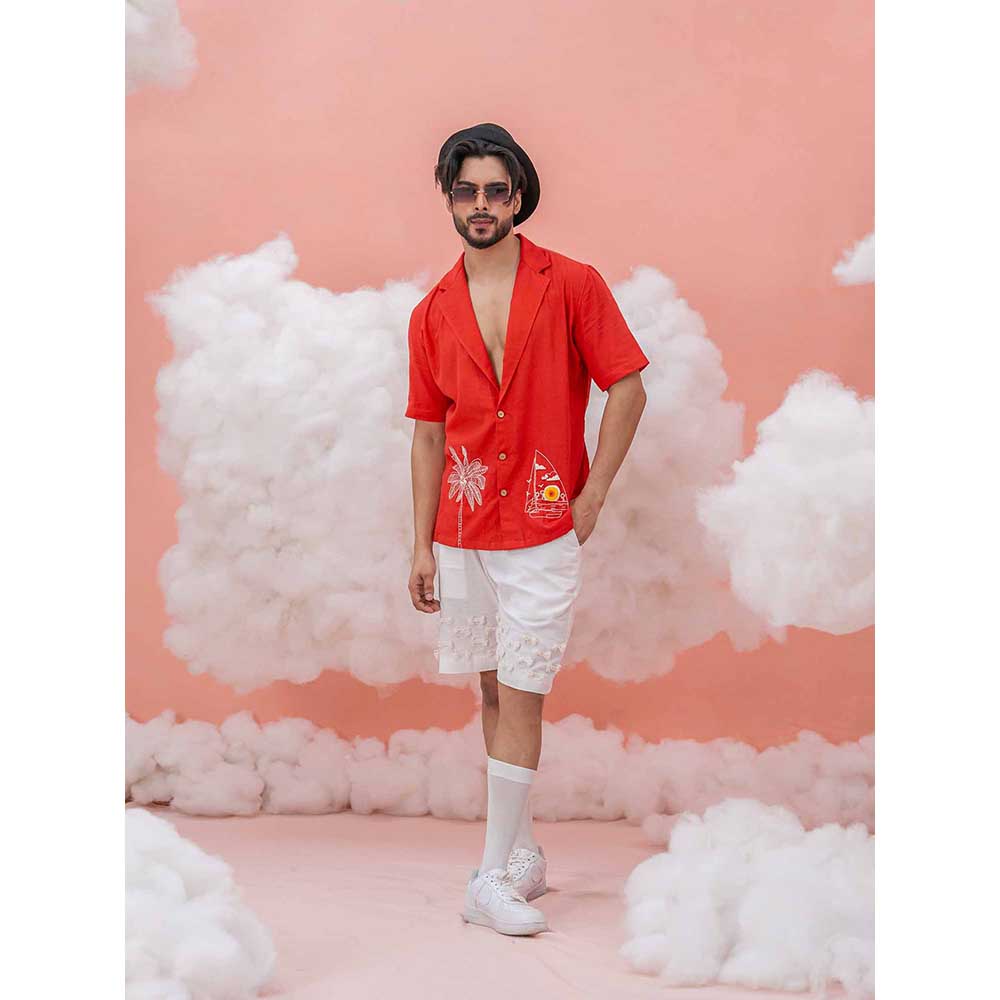 Description : A Hand-Dyed Fiery Red Coat Collar Linen Cotton Shirt, Embedded With Delicate Palm Tree And Sailboat Embroidery, Brought To Life With Pearls, Silk Threads, And Beads. This Vibrant Piece Is An Essence Of A Tropical Escape With Meticulous Artistry, Embracing The Laid-Back Exploratory Vibe Of Summer With A TouchOfLuxury.
