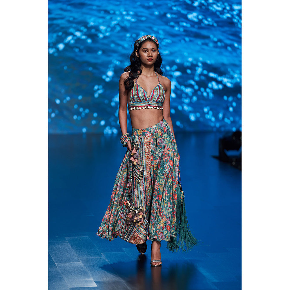 Description : Enhance your style with this fancy turquoise co-ord set from RV Pret. Made from high-quality crepe, the crop top features a sleeveless design and shoulder straps. It is paired with a fancy skirt. Style it with minimal jewellery and sandals to complete the ensemble.