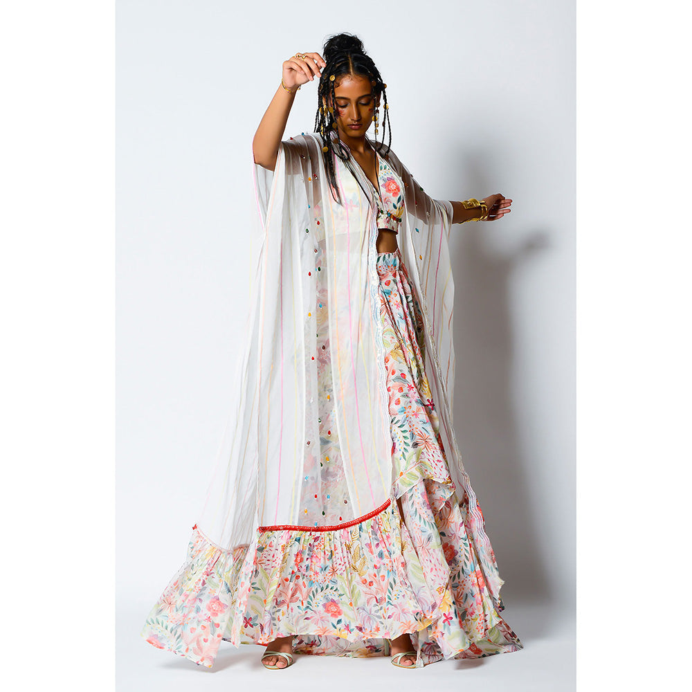 Description : Enhance your style with this fancy multi-color co-ord set from RV Pret. Made from high-quality crepe, the bralette features a sleeveless design and shoulder straps. It is paired with a fancy skirt and a stylish cape. Style it with minimal jewellery and sandals to complete the ensemble.