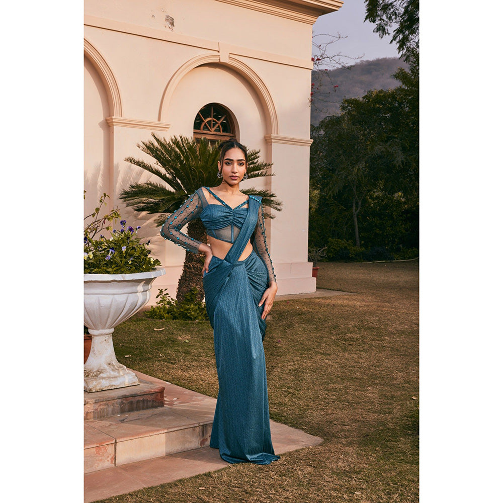 Saanjh by Lea Uzma Teal Chiffon Pre-Draped Saree with Stitched Blouse