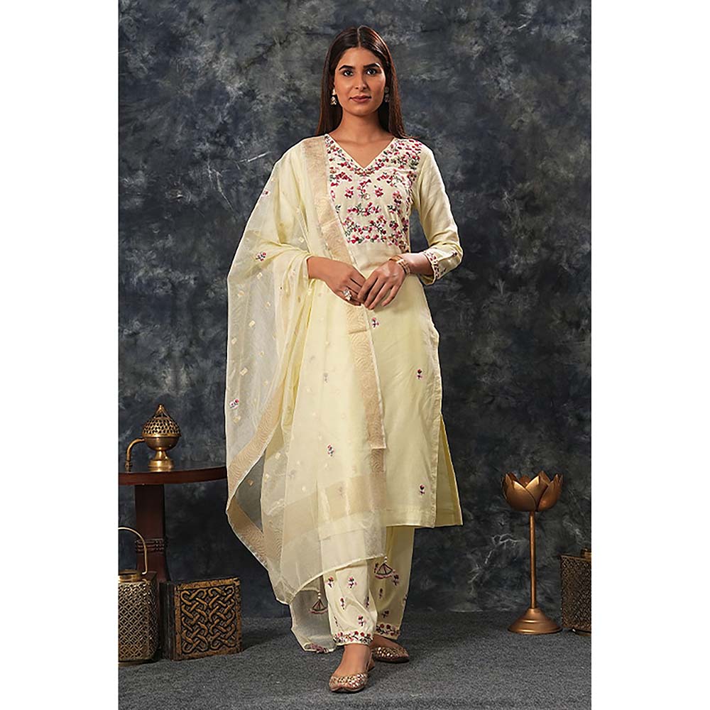 Saatvikei Saumya - Lemon Yellow Kurta with Palazzo and Dupatta (Set of 3)