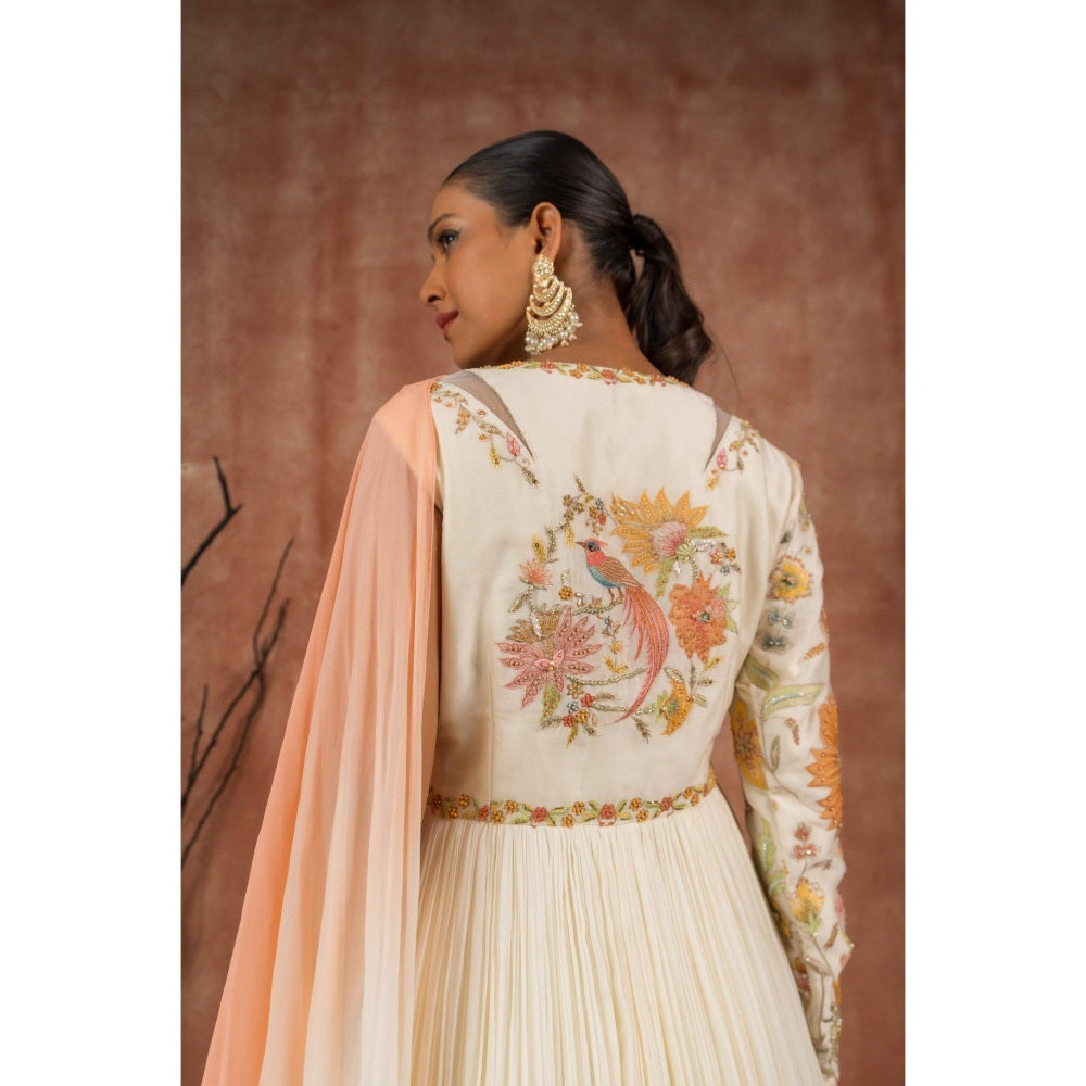 Description : Featuring A White Chanderi Anarkali with Modern Chintz Hand Embroidery In Tones Of Pastel Yellow, Pink, Orange Using Pearls, Sequins, Beads and More On Yoke, Sleeves and A Bold Matching Embroidery On The Back with An Attached Peach Drape On One Shoulder with Georgette Gathered Flare. It Is Paired with A Matching Lycra Churidar.