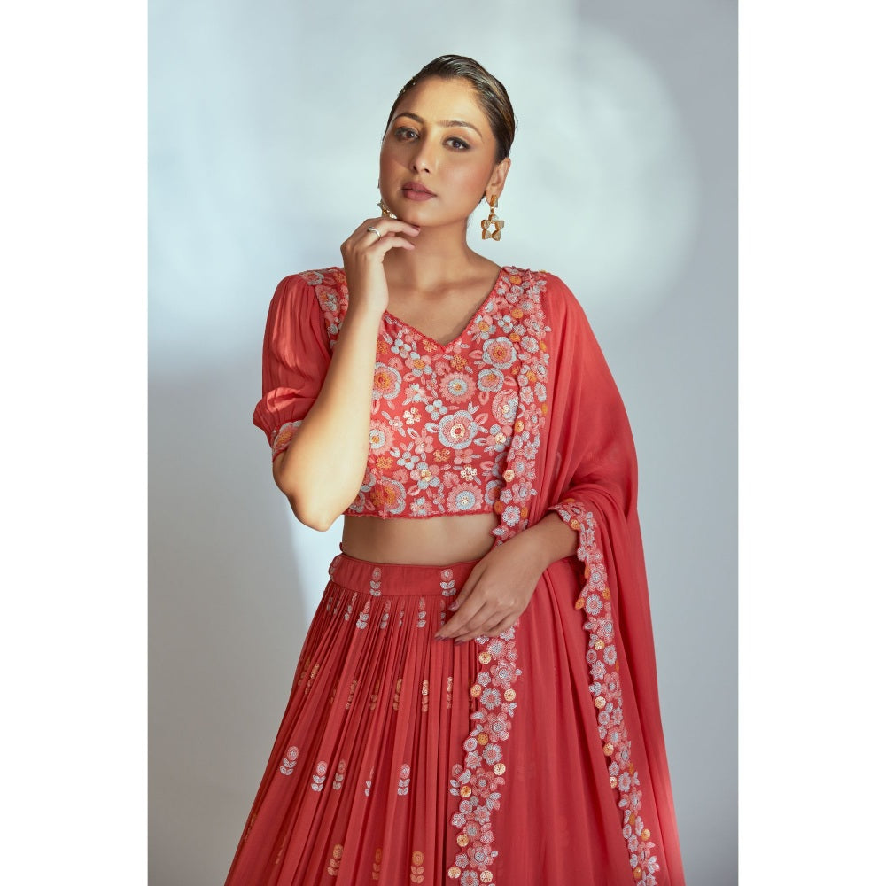 Coral Womens Embellished Blouse with Lehenga and Dupatta (Set of 3)