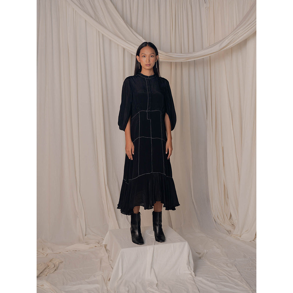 Description : This Calf Length Dress Has Ruffles At The Bottom and Dramatic Sleeves, The Dress Features White Stitching That Adds A Touch Of Sophistication It Its Minimalistic Design