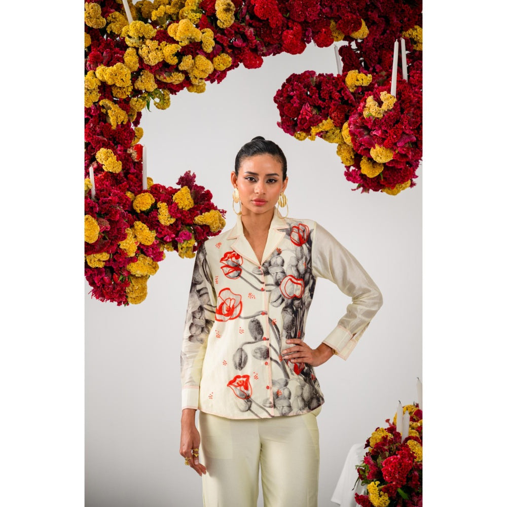 Description : Fall in love with the Amour Shirt, where vintage florals meet modern romance in premium off-white Chanderi. The delicate floral print is brought to life with striking 3D red beadwork, while red self-stitch detailing adds a chic finish along the seams. The back features a unique pleat design-half-closed for a flattering silhouette, and open from the waist down for a flirty touch of movement.
