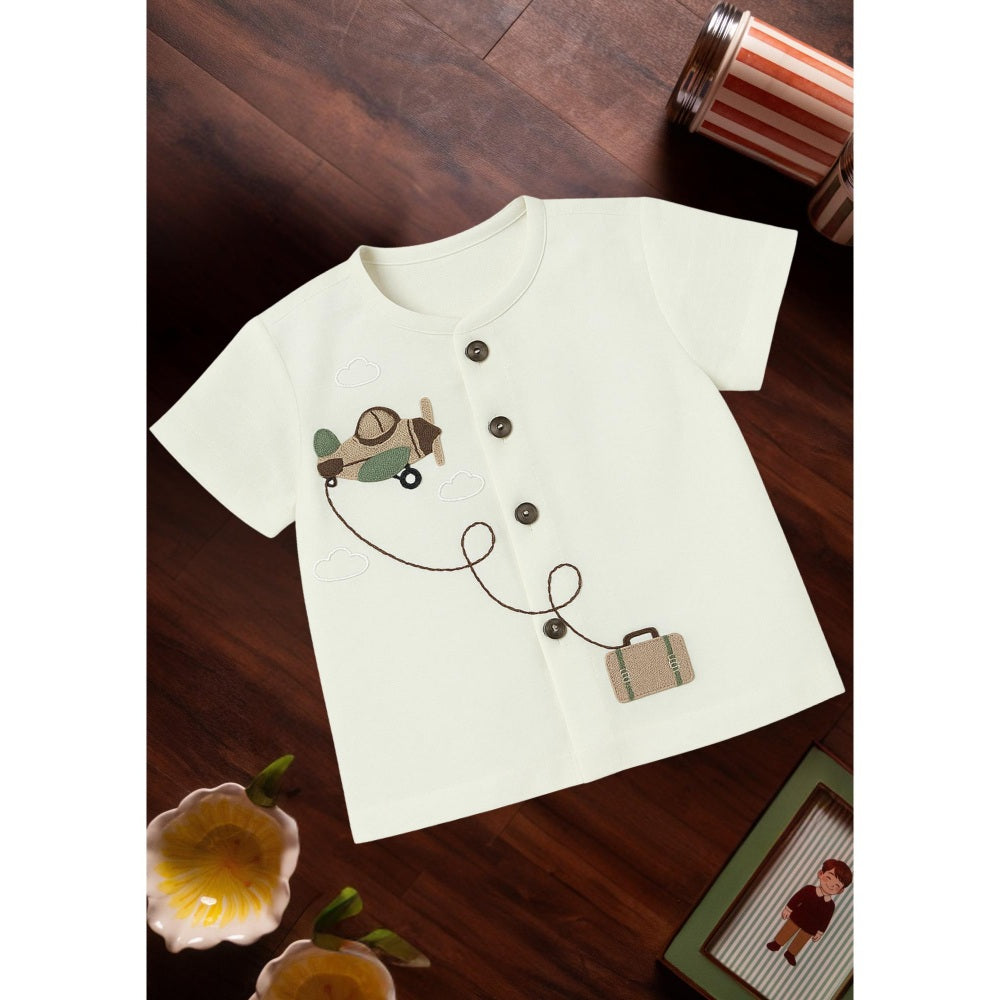 Description : Fly high in style. This button-down shirt features delicate airplane and suitcase embroidery, crafted for your little explorer s everyday adventures