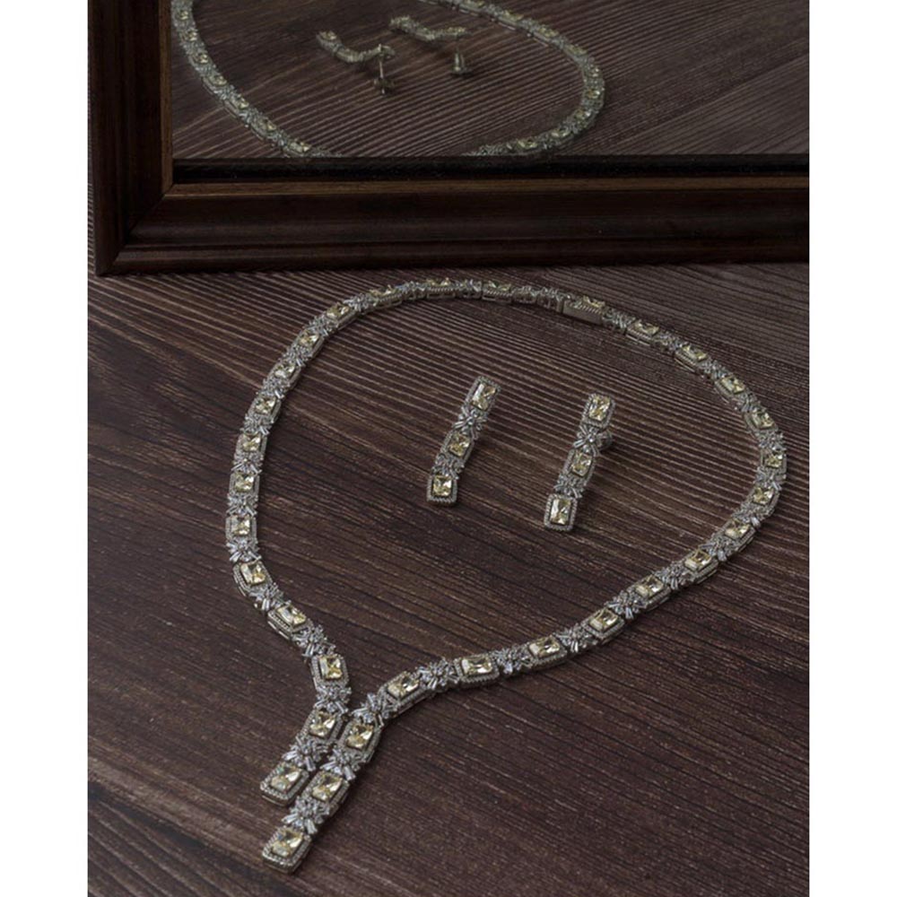 Description : This elegant silver-tone necklace set features rectangular yellow stones bordered with intricate white stonework. Paired with matching earrings, it s perfect for adding a touch of sophistication to any outfit.