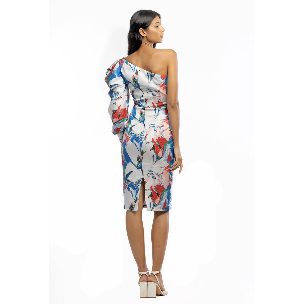 Satin Printed One Shoulder Draped Dress Ivory & Blue