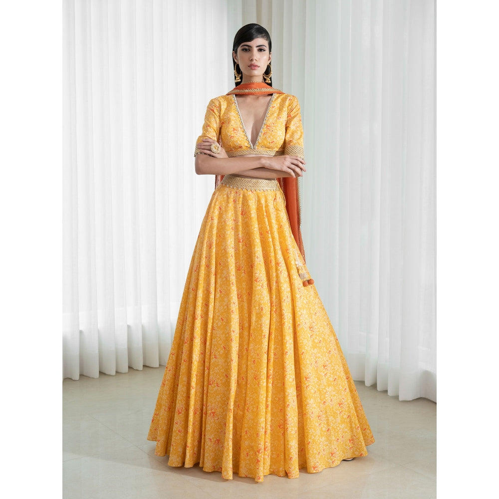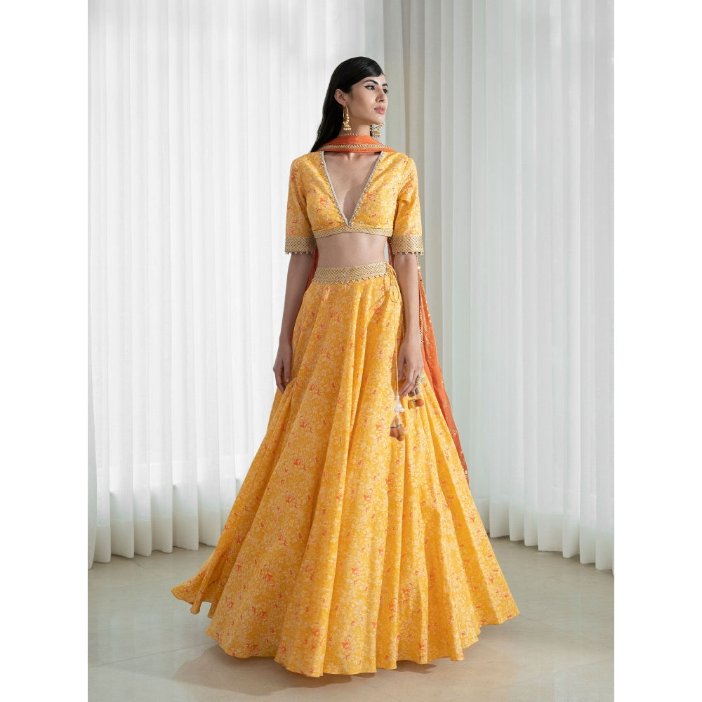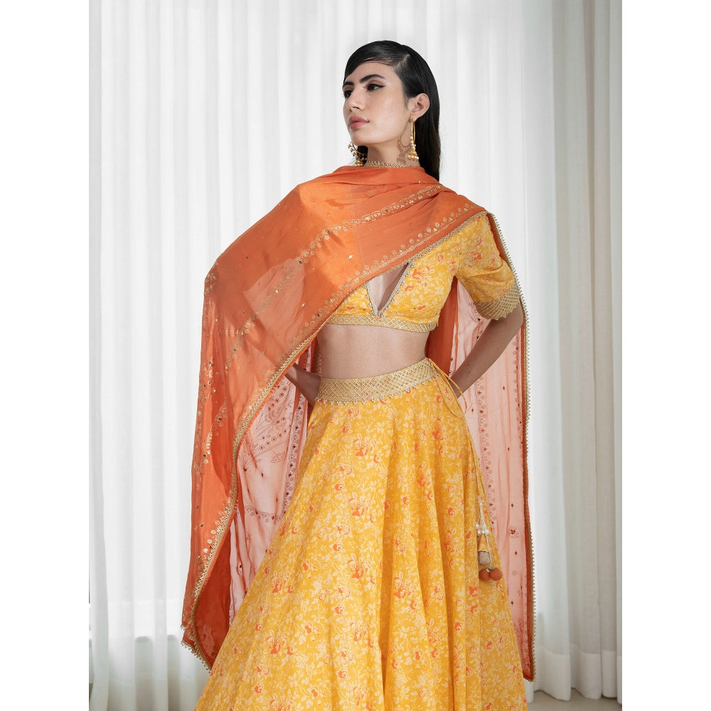 Description : Mustard printed blouse with lace and pearl details. and lehnga with lace detail on belt styled with orange foil printed dupatta enhanced with mirror work