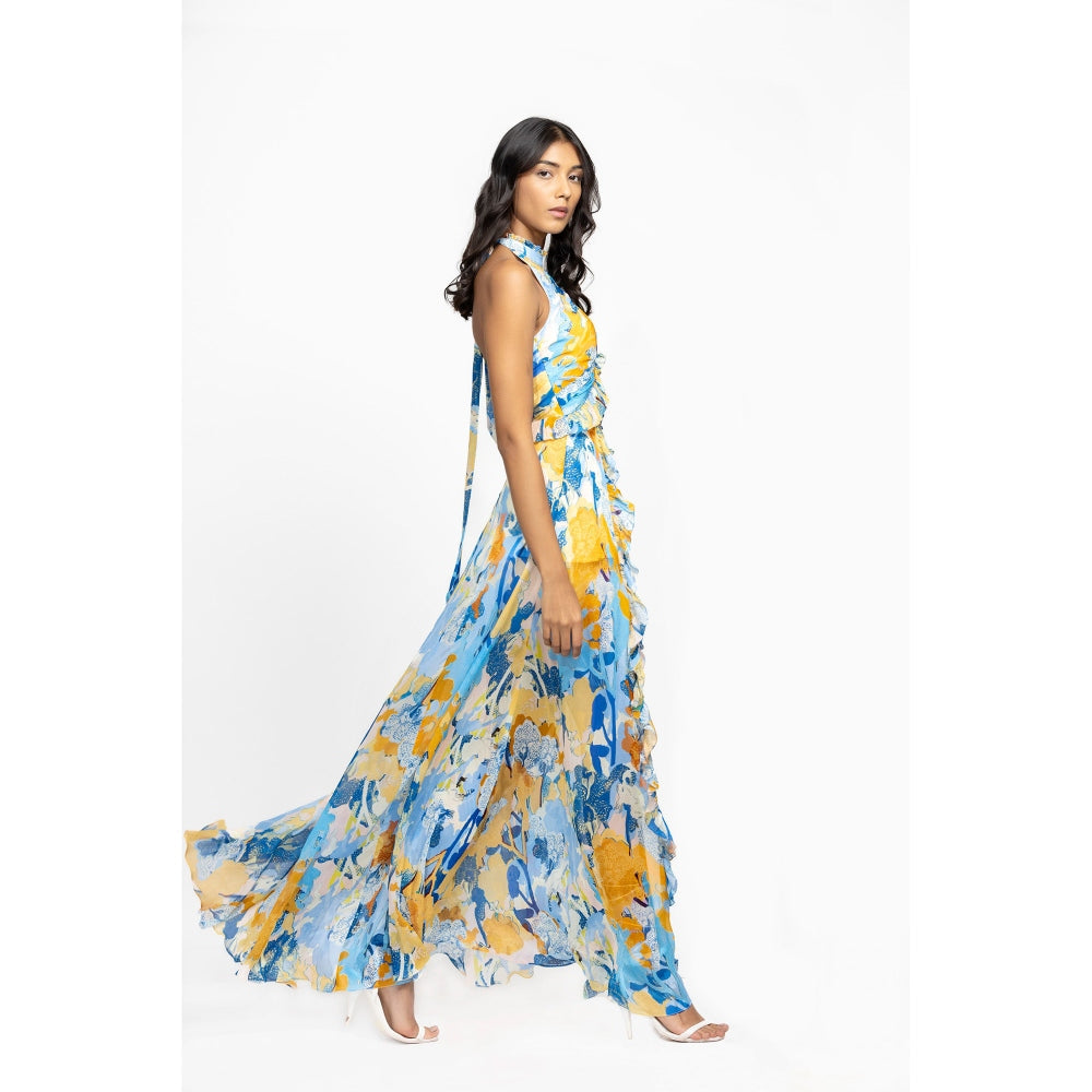 MANDIRA WIRK Chiffon Printed Halter Neck Long Dress Yellow & Blue
