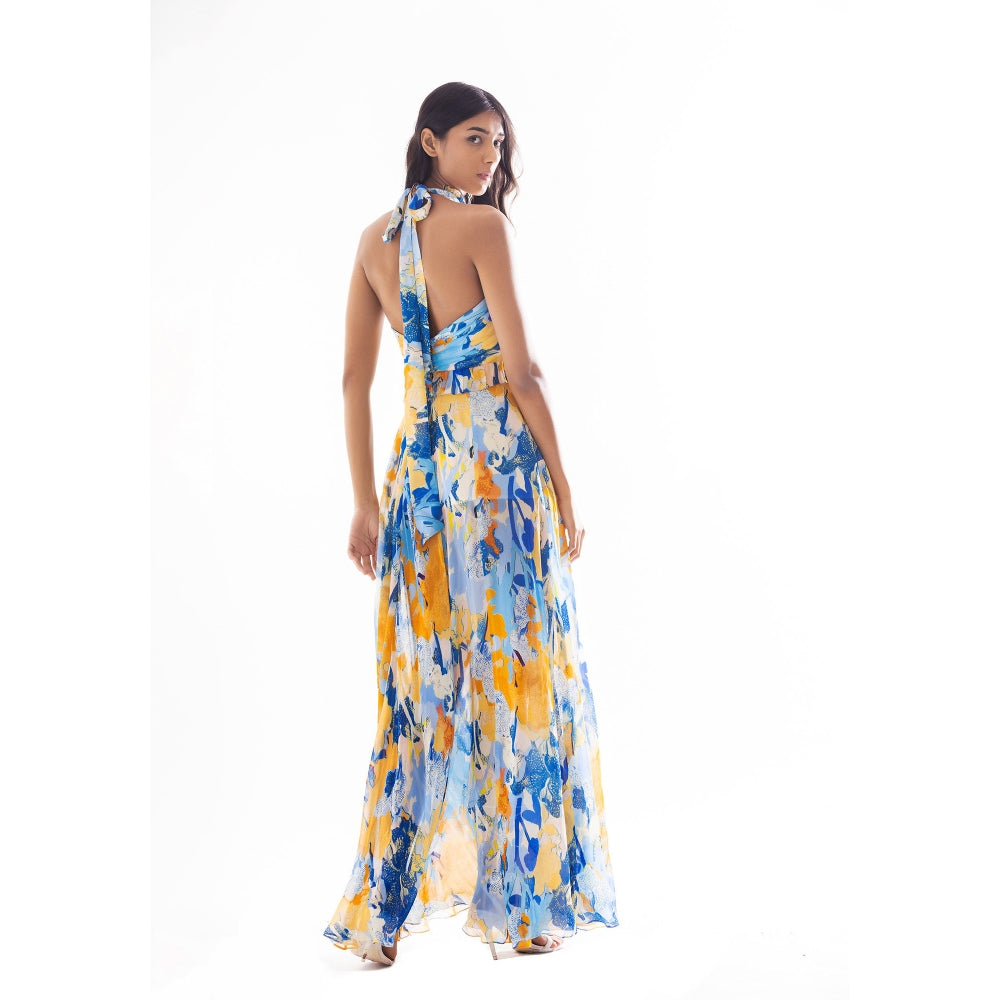 Chiffon Printed Halter Neck Long Dress Yellow & Blue