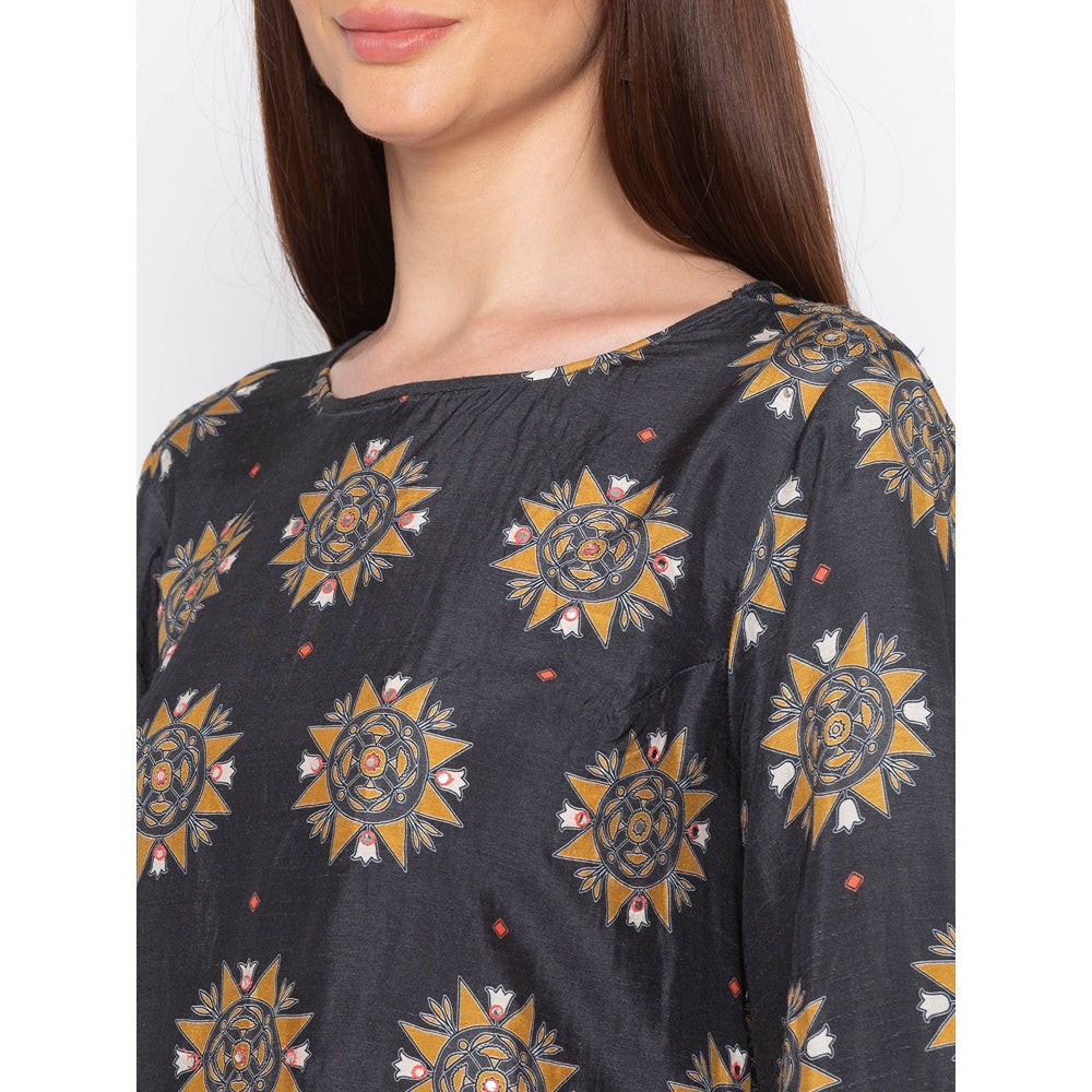 Description : Printed Boad Neck High-Low Kurta Paired With Printed Solid Colour Pants.