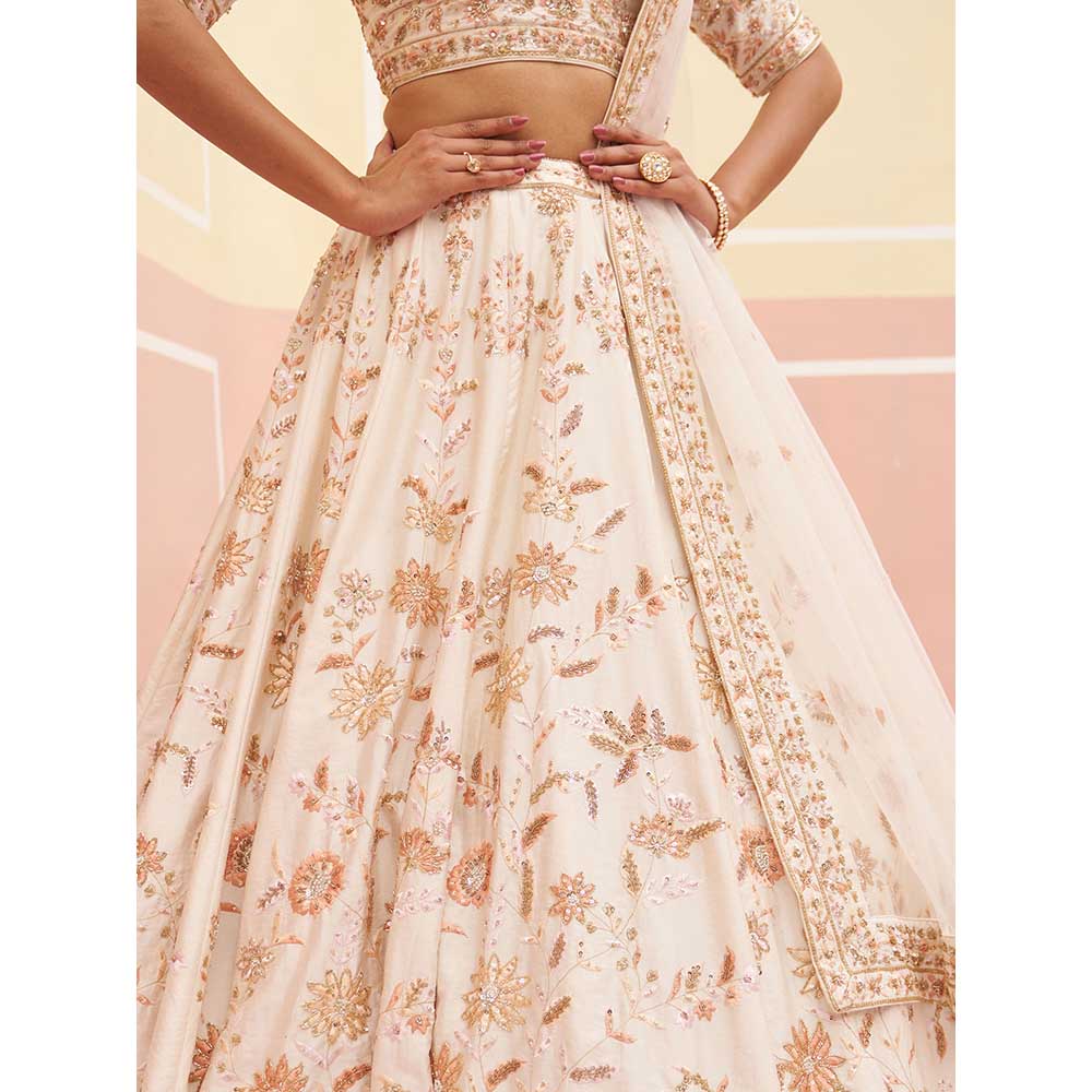 Description : Get your wedding look sorted with this ivory lehenga choli from ANGAD SINGH. Crafted from raw silk and embroidered with traditional zardozi technique using silken threads, it is finished with half sleeves and a round neck. Complete the look with heels and statement jewellery.