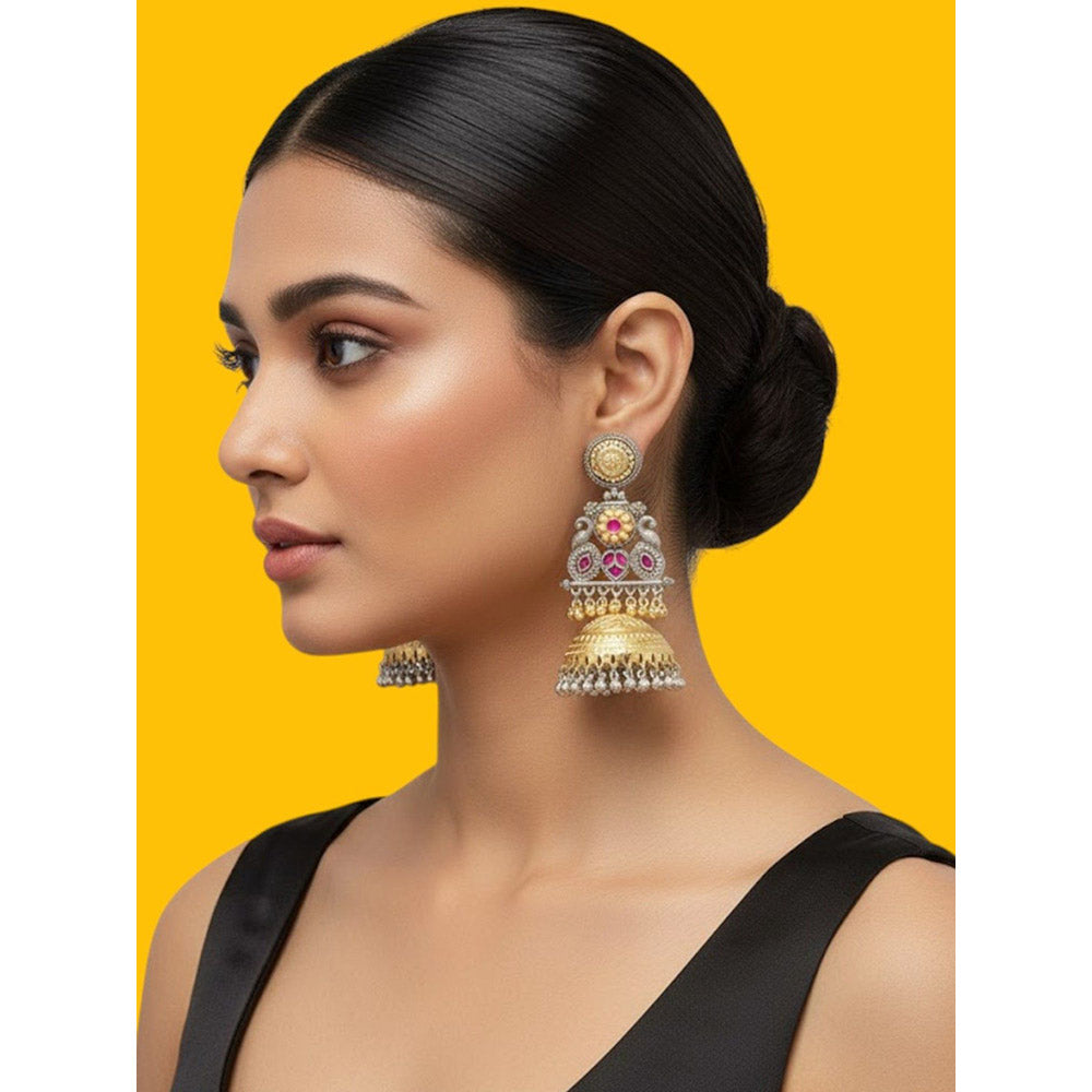 Description : Elevate Your Ethnic Charm with These Exquisite Handcrafted Jhumka Earrings, Featuring A Stunning Dual-Tone Gold and Silver Finish. Adorned with Intricate Floral Motifs, Faux Pearls, and Pink Synthetic Stones, These Earrings Blend Traditional Temple-Inspired Artistry with Contemporary Elegance. The Dome-Shaped Jhumka Base Is Enhanced with Cascading Bead Work, Making It A Perfect Accessory For Festive Celebrations, Weddings, and Traditional Occasions. Designed To Make A Statement, These Earrings Are Lightweight and Comfortable To Wear Throughout The Day.