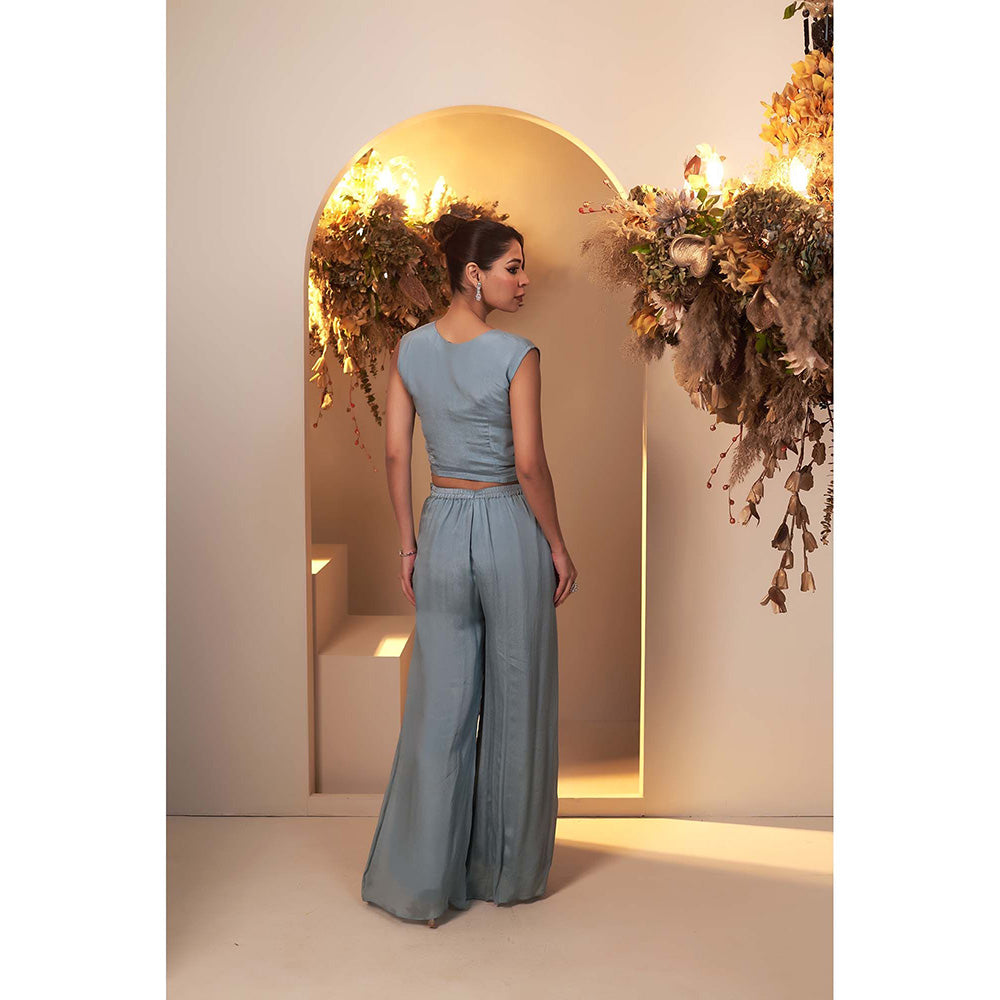 Baidehi Blue Embroidered Crop Top with Palazzo and Jacket (Set of 3)