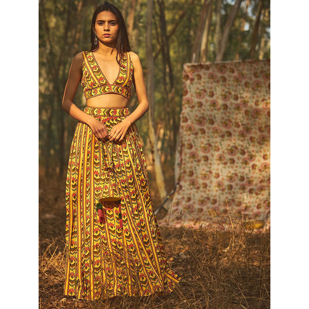 Description : This plunge-neckline hand-embroidered blouse in a striped border print in a crepe fabric is a versatile option and can be paired with a skirt and flats to complete the look.