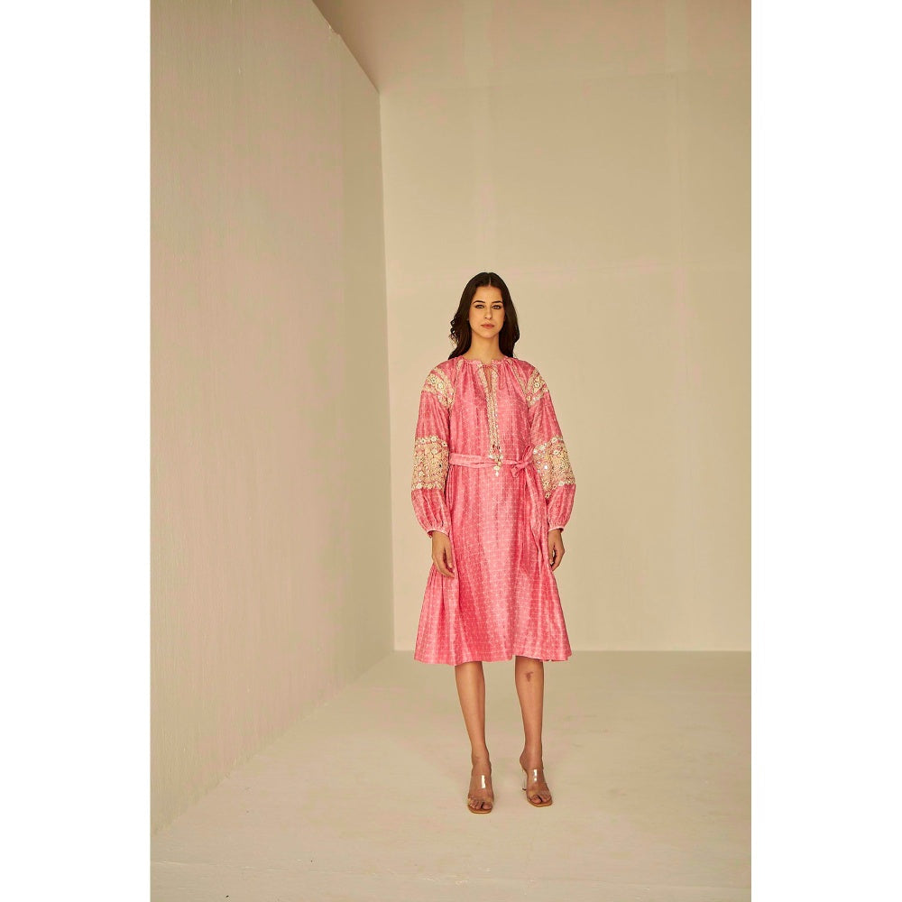 Description : Add zest and zing to your look by wearing this pink dress and waist tie set from BeTrue. Tailored with care from chanderi, it features a keyhole neck, embroidered detailing, and is enhanced with a comfortable fit. It assures soft and soothing touch against the skin. Tag it with a pair of kitten heels and bold makeup for a chic look.
