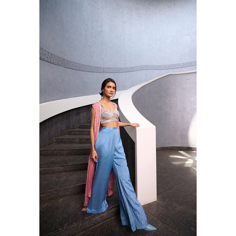 Description : Take your style game up a notch with this blue jacket set from Chamee and Palak. Crafted from georgette, this beautiful set is finished with a sleeveless design and shoulder straps. Style it with a pair of heels and minimal jewellery pieces.