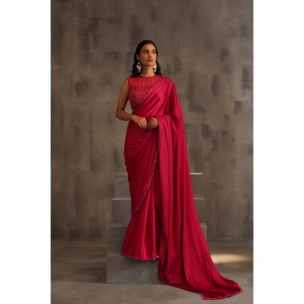 Description : Deepika Chadha's Stunning Pink Net Fabric Blouse Beautifully Adorned With Intricate Sequins, Cut dana, Beads, Embroidery. The Flowy Fuchsia Armani Satin Saree Keeps You Comfortable All Day Long And Is Perfect For Wedding And Festive Season.