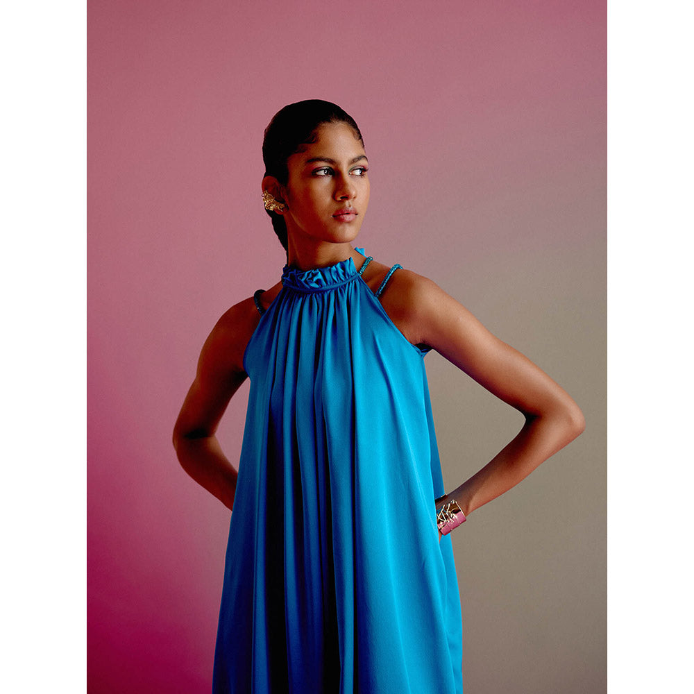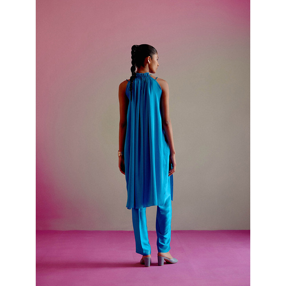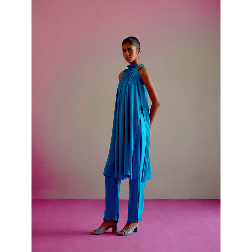 Description : Elevate your look with this blue co-ord set from DRISHTI CHHABRAA. Crafted from satin, it is finished with a sleeveless design and halter neck. Team this co-ord set with a pair of wedges or trendy flats to complete the look.