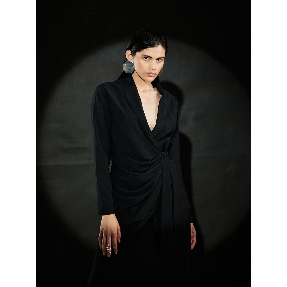 Description : Our Black Blazer with Cowl Set .This chic blazer features a unique cowl detail on the waist, enhanced by a stylish tie-up, and comes complete with matching pants for a coordinated and polished look. Immerse yourself in the classic allure of black, a color that exudes sophistication and versatility. This ensemble is a modern interpretation of a timeless favorite, perfect for various occasions. The blazer is adorned with a cowl detail on the waist, adding a touch of contemporary flair to the classic silhouette. This design element creates a subtle drape that enhances the waistline, flattering and feminine. The ensemble is completed with matching pants, creating a cohesive and sophisticated look. The pants are tailored for comfort and style, ensuring a polished appearance from head to toe.Whether you is attending a formal event or a professional meeting, this black blazer ensemble is a versatile choice. Pair it with heels for a dressed-up look or opt for flats for a more relaxed vibe. Crafted with attention to detail and comfort in mind, this black blazer and pants is crafted in luxurious crepe which is comfortable and luxurious .