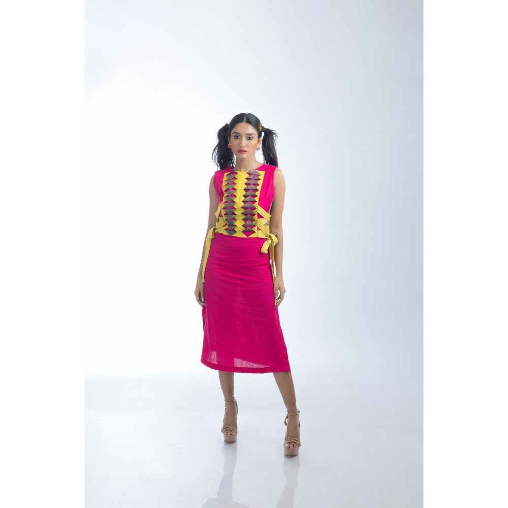 Description : Pink Cotton Dress Featuring Fabric Manipulation With Dual Colores And An Attention-Grabbing Tie-Up Design Made From Yellow Webbing That Runs From The Chest To The Waist.