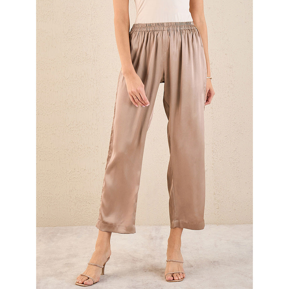 First Resort by Ramola Bachchan Hazel Brown Pintucked Straight Satin Pant
