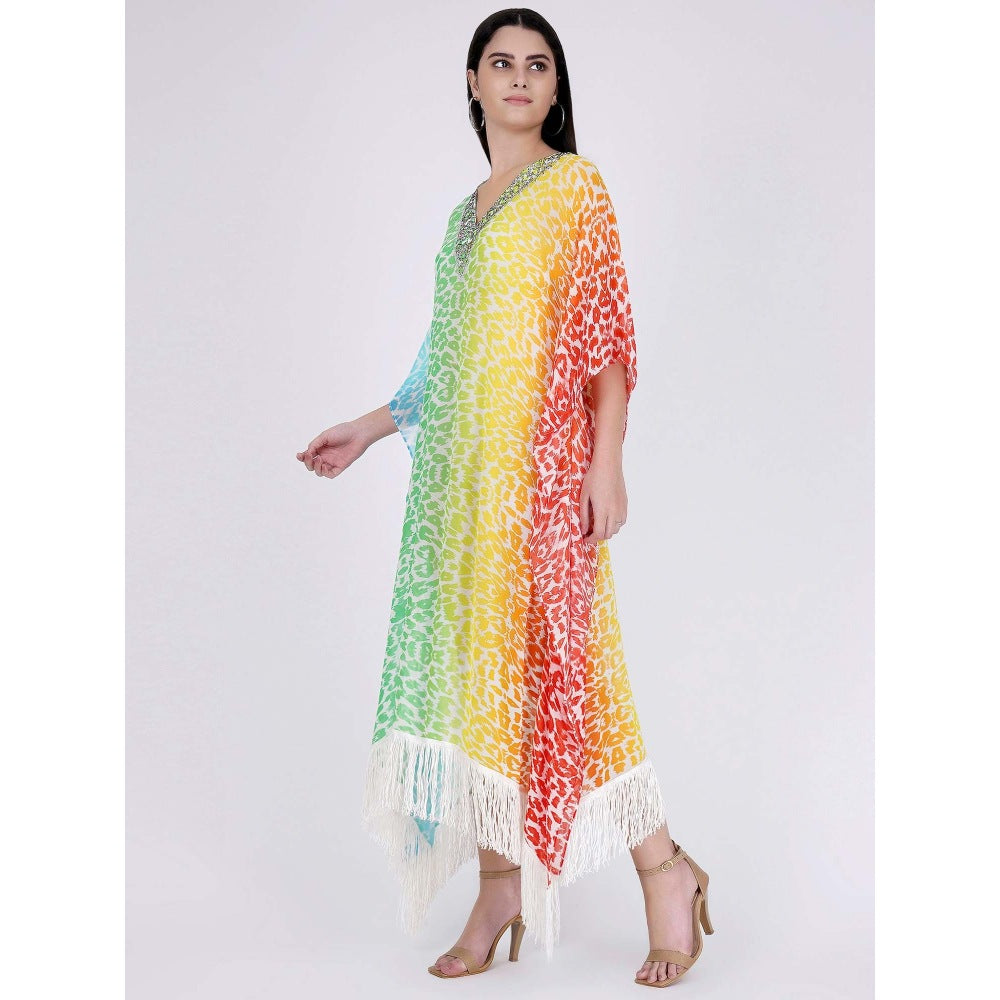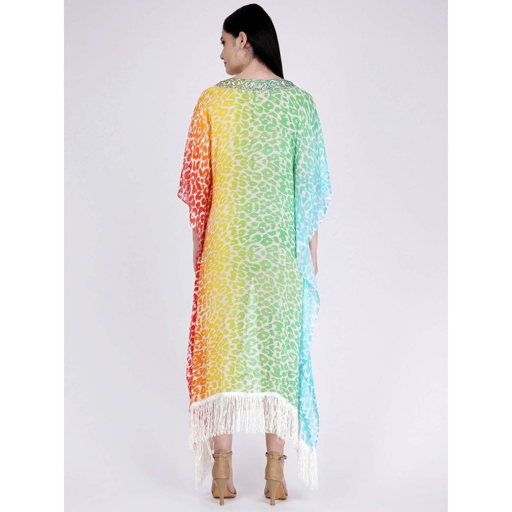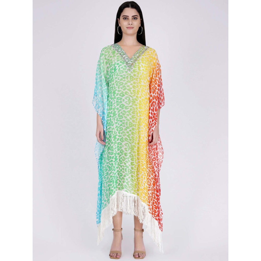 Description : Embrace unique and colourful animal print mid length kaftan from First Resort by Ramola Bachchan enhanced with crystal embellishment and finished with white fringe at the hem. Club with a pair of leggings and juttis for an ethnic outfit.