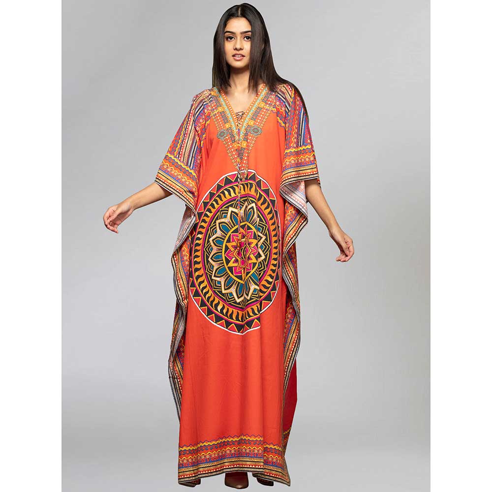 First Resort by Ramola Bachchan Orange Tribal Full Length Kaftan