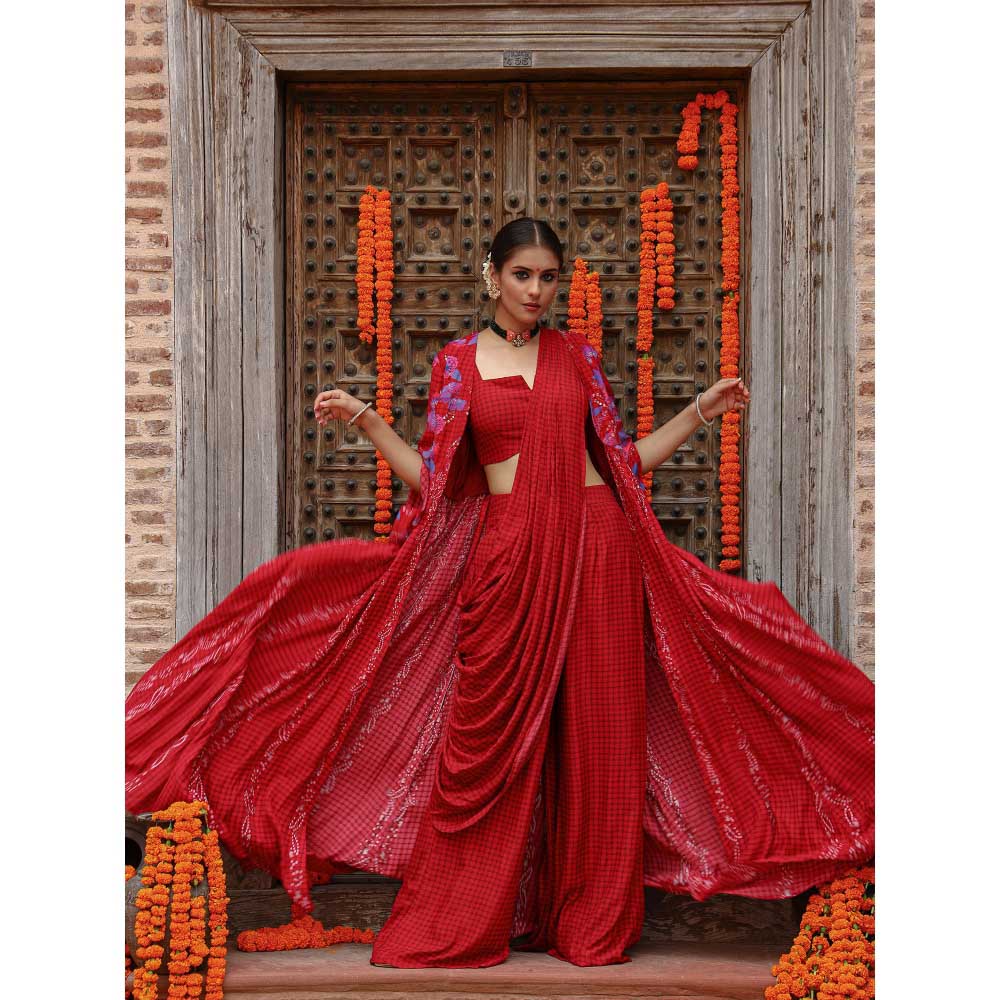 Gazab By Miku Kumar Red Elsa Drape Palazzo with Cape and Blouse (Set of 3)