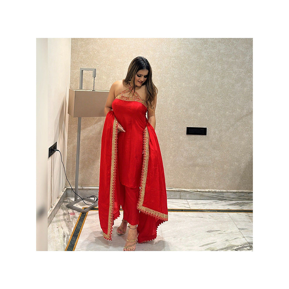 Red Women Halter Kurta with Pant and Dupatta (Set of 3)