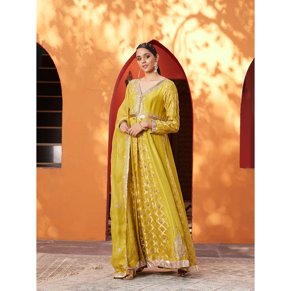 House of Supriya Mustard Embellished Raw Silk Anarkali Kurta with Pant & Dupatta (Set of 3)