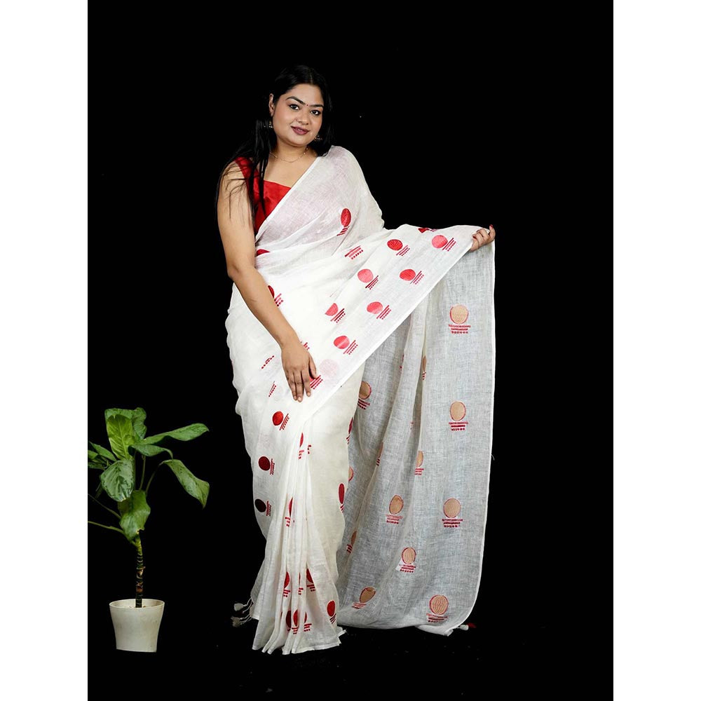 Description : Linen With Red Geometric Motif Weave With Tassel Ready To Wear Saree