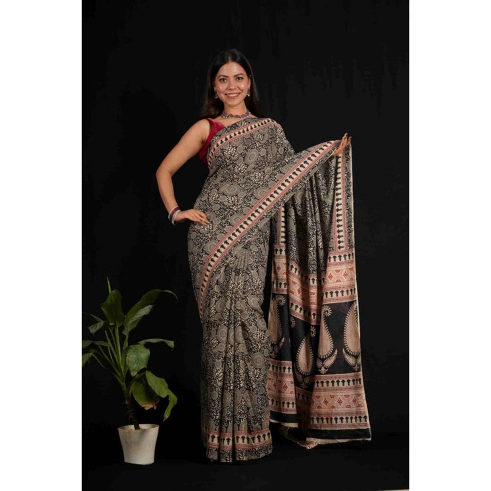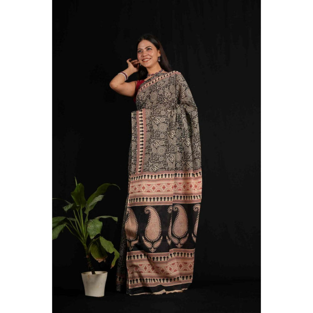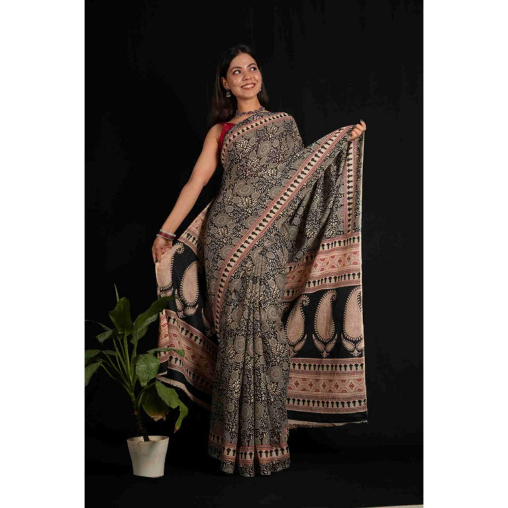 Womens Block Print Black Pre-Draped Saree with Unstitched Blouse