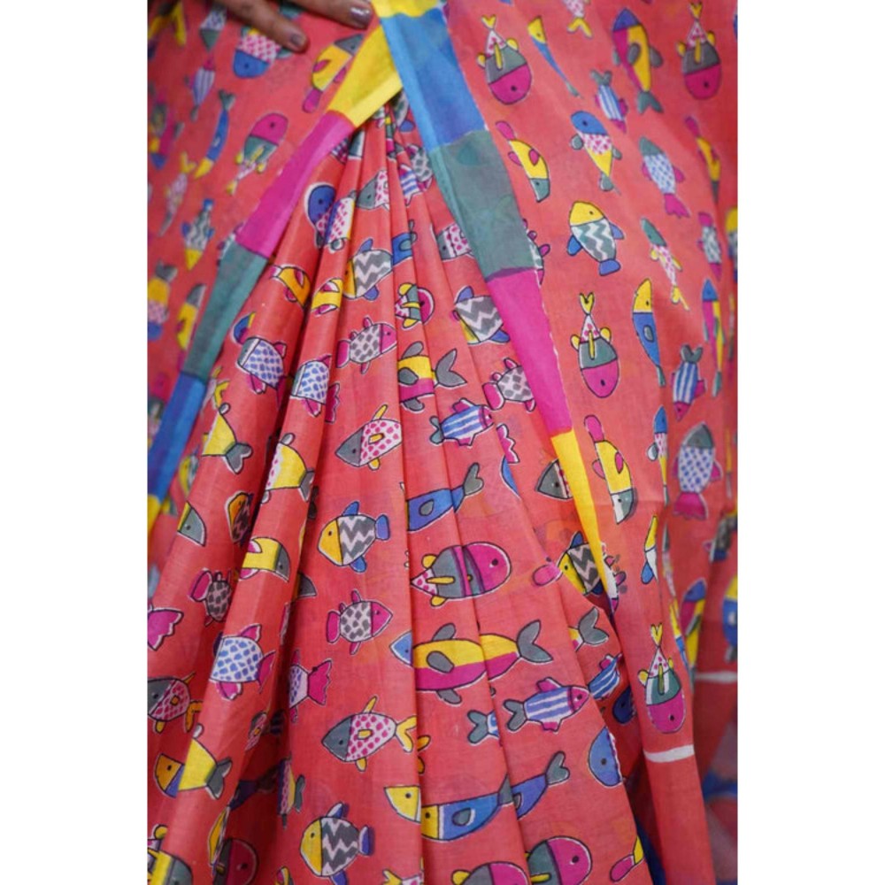 Isadora Life Womens Block Print Red Pre-Draped Saree With Unstitched Blouse