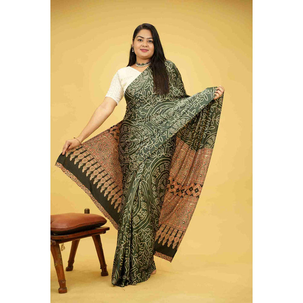 Womens Printed Green Pre-Draped Saree with Unstitched Blouse