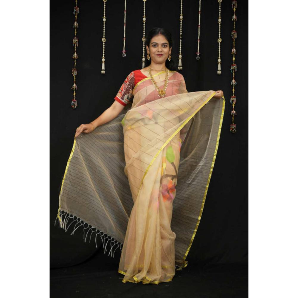 Isadora Life Womens Stripes Tassels Beige Pre-Draped Saree With Unstitched Blouse