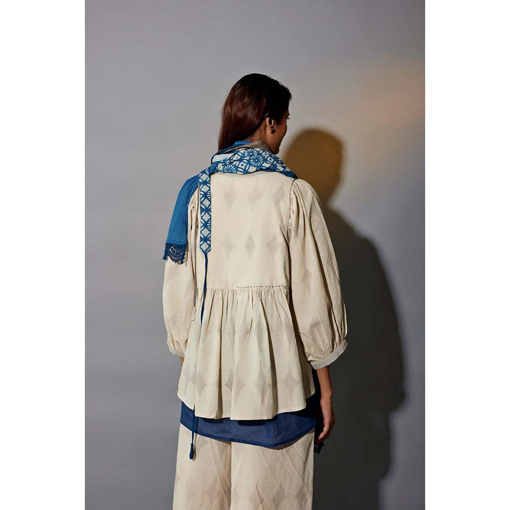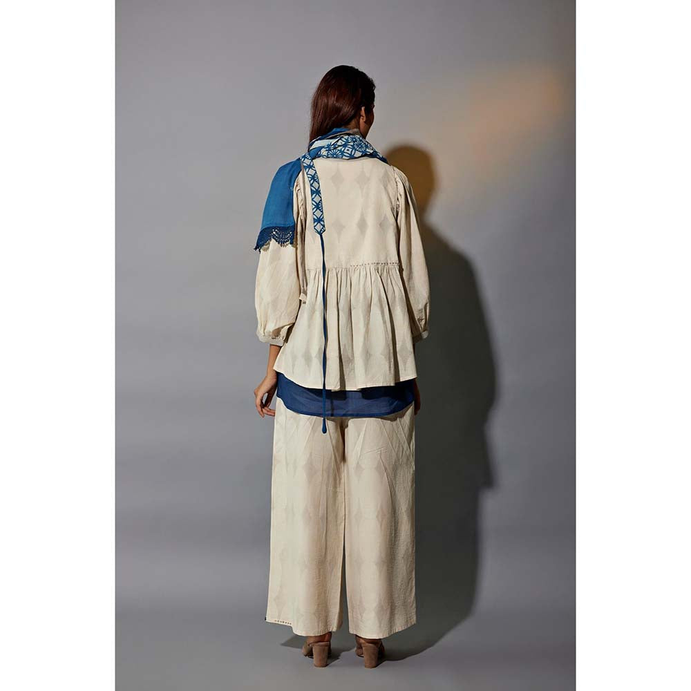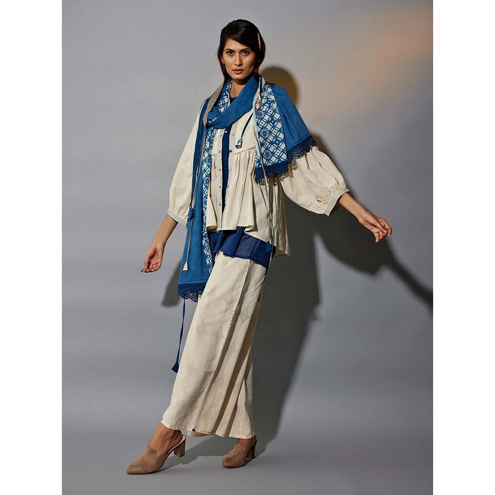 Description : Four piece set featuring Short Printed Ruffled top with solid indigo slleeveless tunic, is paired with ankle length lush cotton soft printed palazzo The set also features a printed Stole, belt to contour the flare at waist to complete the look The set is detailed with JG signature button knot details and lace detail at hem. Fabric : Natural Dyed and Handblock Printed Cotton Blend No. of components : 4 The size guide is as per body measurements