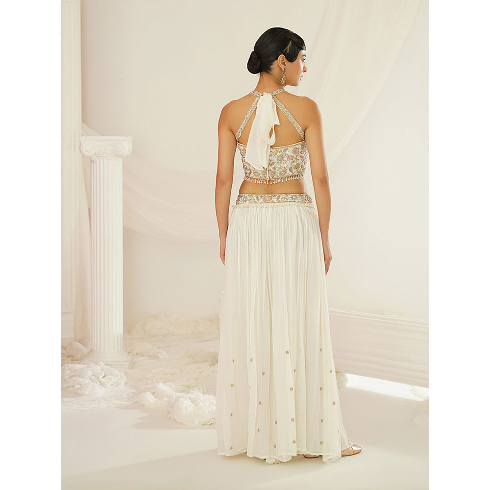 Description : Kapda Dori's Stunning White Georgette Fabric Palazzo Set, Beautifully Adorned with Cut dana, Sequence, Dabka and Pearl Embroidery. The Palazzo Features A Full-Length Flared Look with Gathers On Waist. The White Colour Adds A Touch Of Glamour and Sophistication To Your Look, While The Fabric Texture Ensures You Feel Comfortable All Day Or Night Long. It Is Styled with A Ivory Halter Neck Choli Adorned with Hand Embroidery with Pearls, Crystals, Sequens and Dabka. It Is Paired with Georgette Dupatta.
