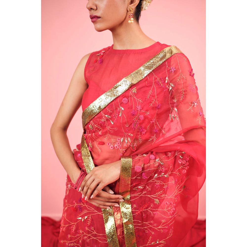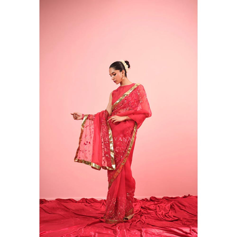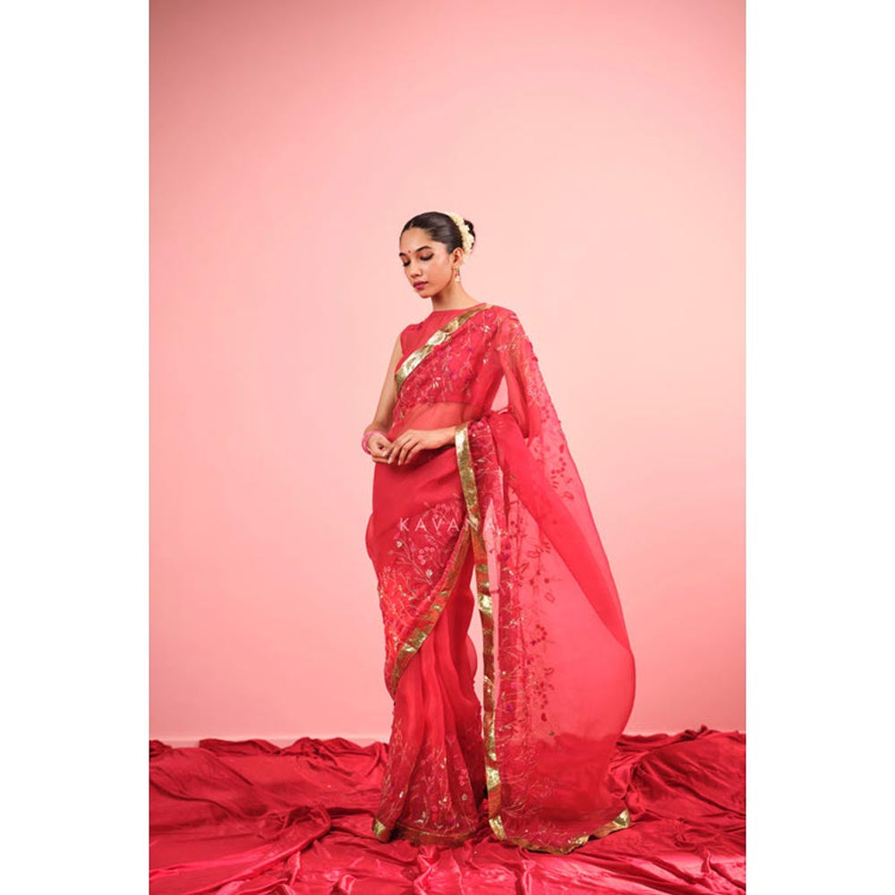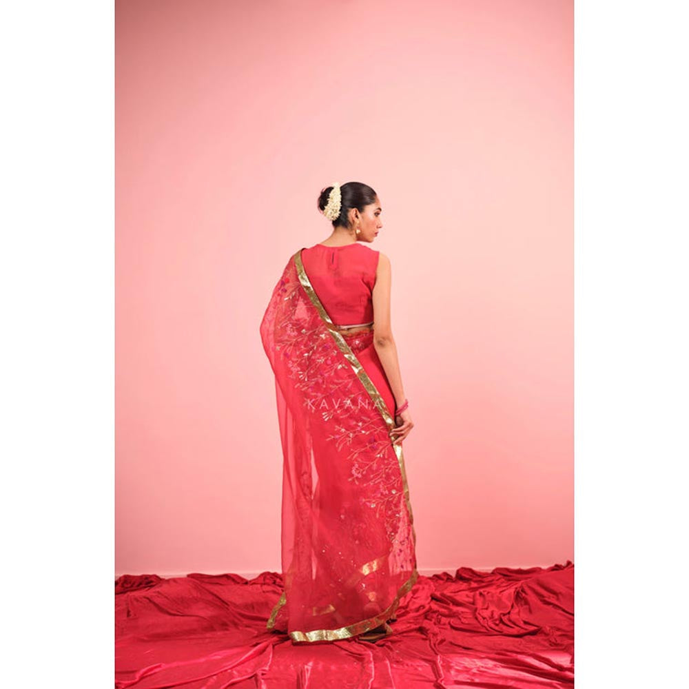 KAVANA Women Embroidered Red Aarzoo Silk Organza Saree